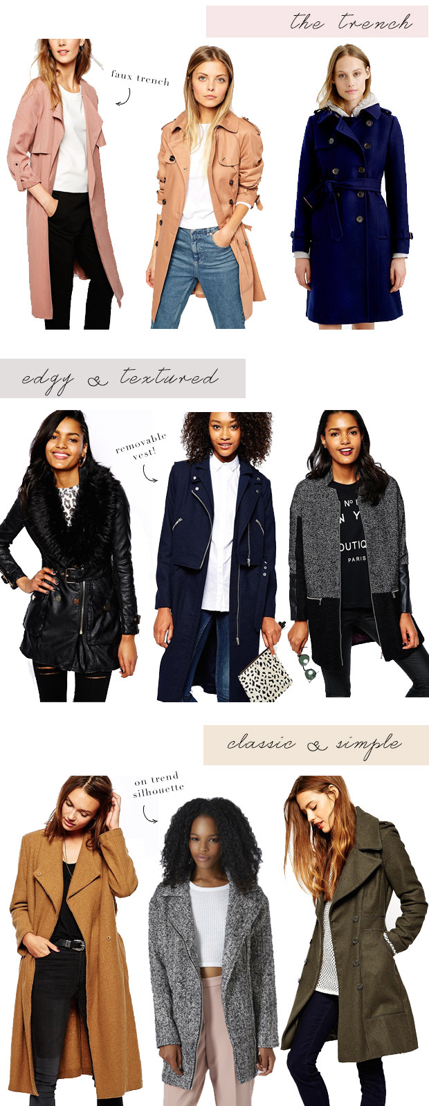 Now that the temperatures are finally starting to drop – at least around here – I’ve realized I’m in major need of a fall coat appropriate for oh-so-stylish New York City. I grew a solid coat collection from living in San Francisco, where it’s pretty much fall all year round, but most of those coats I’ve had for years, so I’d say it’s time for an update. A classic trench is always a necessity, especially for the working girl. To mix things up, I’ve been wanting to try a faux trench for a cool-girl vibe. If you’re into textures and embellishments, try one of these edgier options below, or stick with something classic. I’m curious about that faux leather one below – it’s so unique!