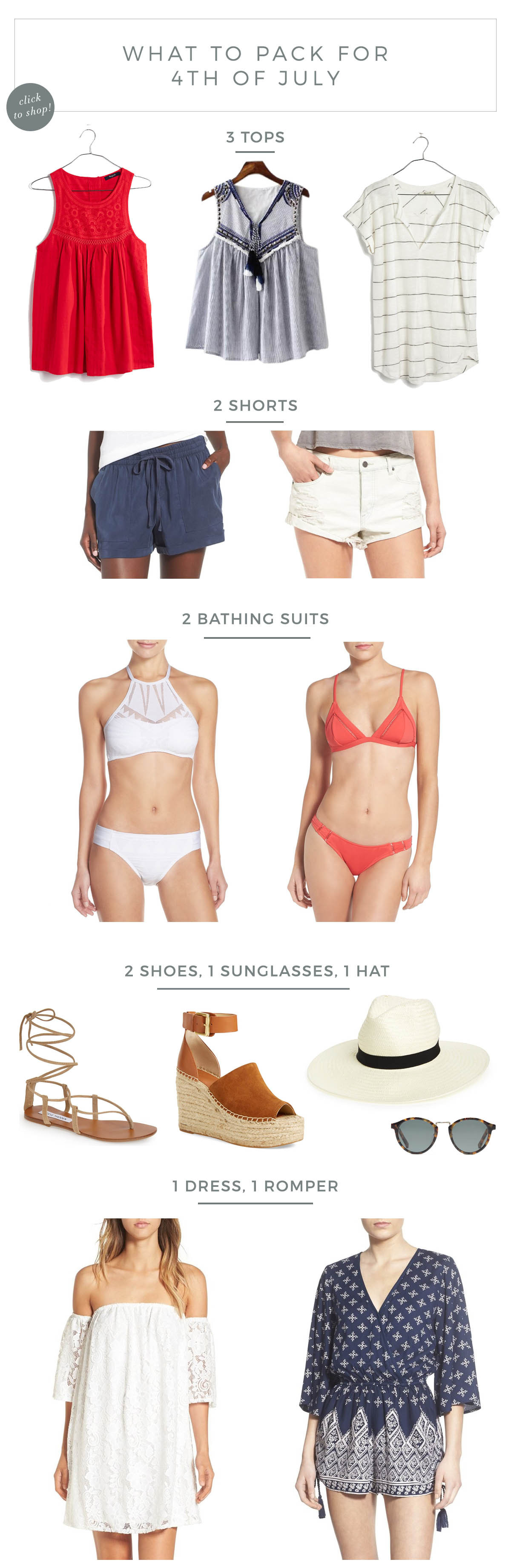 My advice is to keep everything red, white and blue — not just to be patriotic, but also to make it easier to mix and match! If you choose a consistent color palette for your packing list, you can wear everything more than once to create multiple outfits. And the best part about this packing list? Every single item is under $100 (many are even under $50!). I’m particularly shocked that this romper is only $38.40 (I also love the dress version here)! So if you still need to shop for this weekend, or for any of your upcoming summer adventures, click away and get to it!